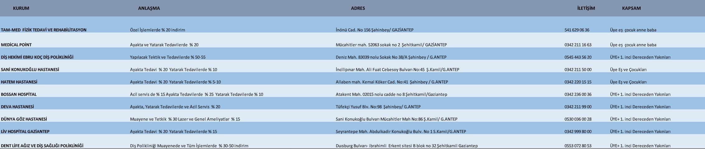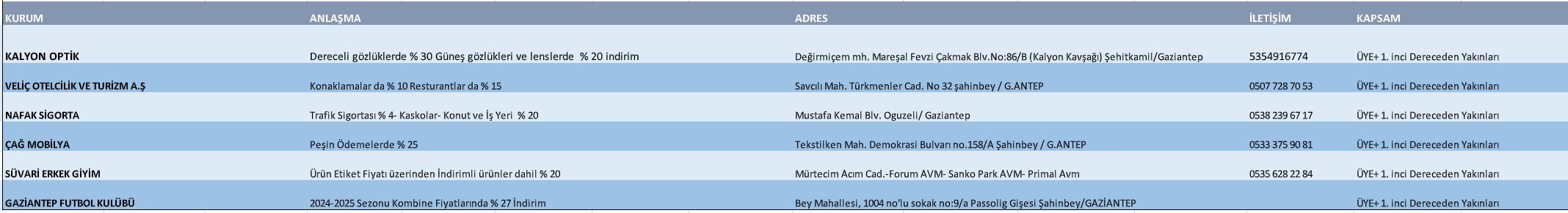 GAZİANTEP İLİ İNDİRİM ANLAŞMALI KURUMLAR