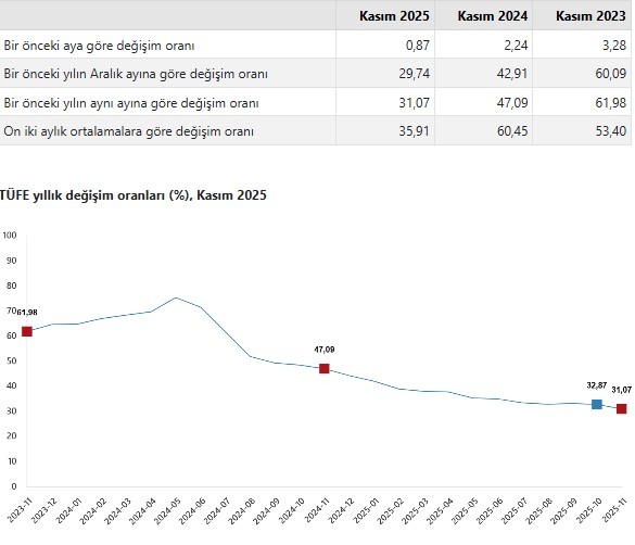 TÜFE’deki (2003=100) değişim 2025 yılı Kasım ayında bir önceki aya göre %0,87 artış, bir önceki yılın Aralık ayına göre %29,74 artış, bir önceki yılın aynı ayına göre %31,07 artış ve on iki aylık ortalamalara göre %35,91 artış olarak gerçekleşti.