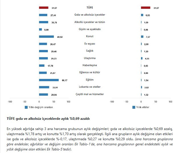 En yüksek ağırlığa sahip 3 ana harcama grubunun yıllık değişimleri; gıda ve alkolsüz içeceklerde %27,44 artış, ulaştırmada %29,23 artış ve konutta %49,92 artış olarak gerçekleşti. İlgili ana grupların yıllık değişime olan etkileri ise gıda ve alkolsüz içeceklerde %6,83, ulaştırmada %4,55 ve konutta %7,57 oldu.