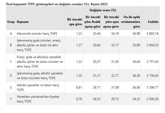 İşlenmemiş gıda ürünleri, enerji, alkollü içkiler ve tütün ile altın hariç TÜFE’deki değişim, 2025 yılı Kasım ayında bir önceki aya göre %1,27 artış, bir önceki yılın Aralık ayına göre %30,64 artış, bir önceki yılın aynı ayına göre %32,17 artış ve on iki aylık ortalamalara göre %35,69 artış olarak gerçekleşti.