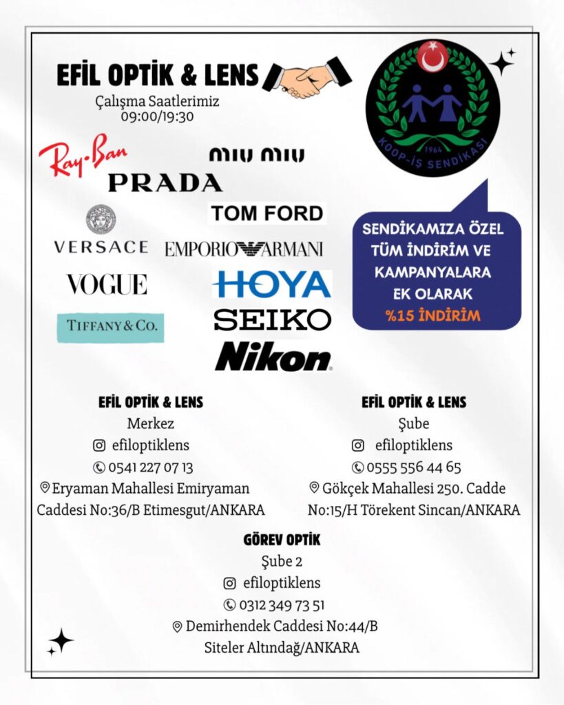 Sendikamız Ankara 1 Nolu Şube Başkanı Yücel Yıldırım, üyelerimizin ve birinci derece yakınlarının faydalanabileceği bir indirim anlaşmasını Efil Optik ile imzaladı.