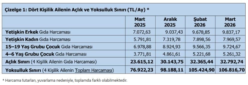 TÜRK-İŞ Konfederasyonu tarafından, çalışanların geçim koşullarını ortaya koymak ve temel ihtiyaç maddelerindeki fiyat değişikliğinin aile bütçesine yansımalarını belirlemek amacıyla her ay, düzenli olarak yapılan bu araştırmanın 2026 Mart ayı sonucuna göre;