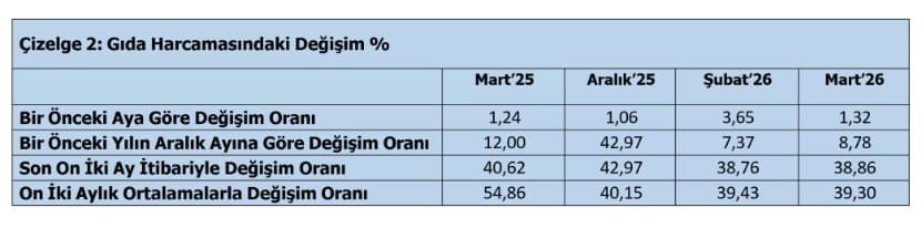 TÜRK-İŞ’ e göre “mutfak enflasyonu” verilerindeki değişim Mart 2026 itibariyle şu şekilde gerçekleşmiştir: