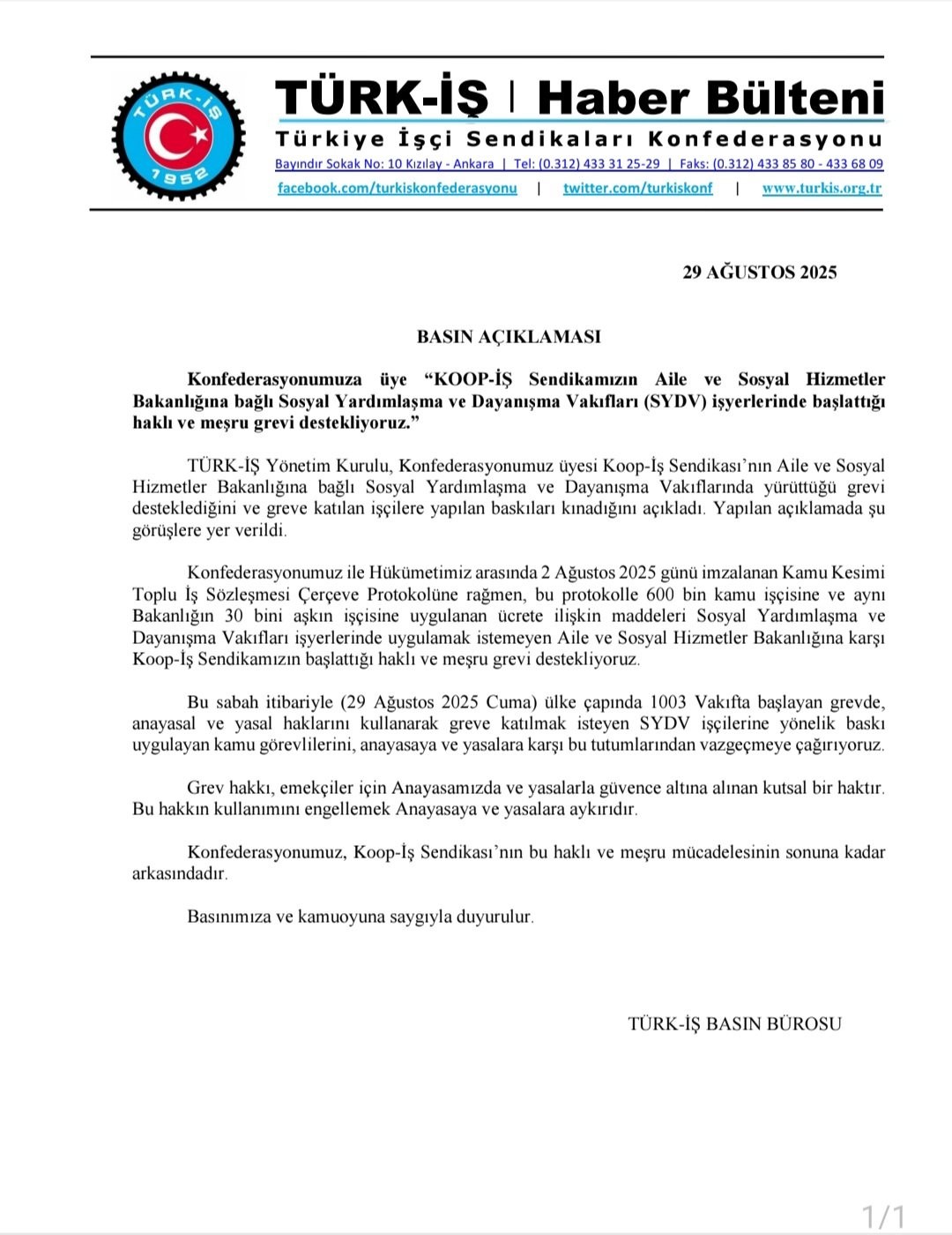 TÜRK-İŞ SYDV İŞYERLERİNDE SENDİKAMIZIN BAŞLATTIĞI GREV KARARINA İLİŞKİN AÇIKLAMA YAPTI