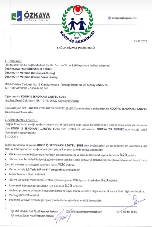 Özkaya Tıp Merkezi ile Ankara -1 Nolu Şubemiz arasında üyelerimiz ve yakınlarını kapsayan indirim protokolü Şube Başkanı Yücel Yıldırım ile Ethem Özkaya tarafından imzalandı.